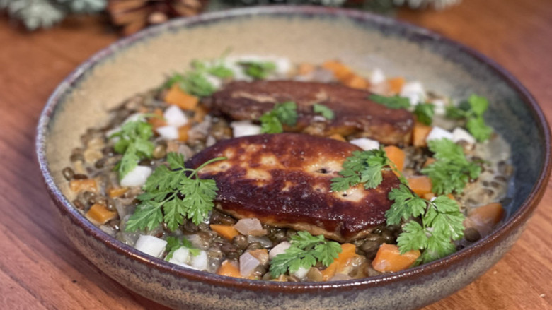 20 décembre 2021Entrée : Soupe de châtaignes au gingembre Plat : Filet de chapon farci au foie gras et laqué au miel